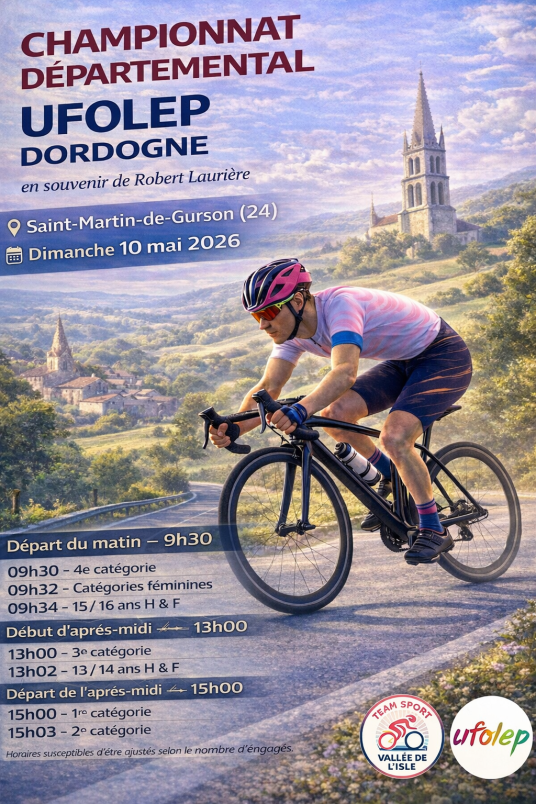 L'UFOLEP 24 a le plaisir d’annoncer l’édition 2026 du Championnat Départemental Cyclosport, qui sera organisé par l'association le Team Sport Vallée de l’Isle tiendra le dimanche 10 mai 2026 à Saint‑Martin‑de‑Gurson.